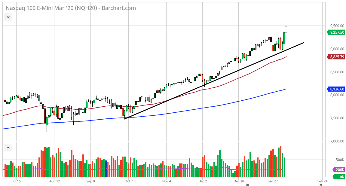 Looking at the chart, there is a clear uptrend line underneath it should offer plenty of support, so if we did get a pullback it should be thought of as a buying opportunity. That buying opportunity could present itself going into the jobs number on Friday, which is also likely to cause a lot of noise in the markets in general. Just below the uptrend line, you have the 9000 level which causes a certain amount of psychological support, as well as the 50 day EMA rallying simultaneously. If that’s going to be the case, then it’s very likely that we should continue to see plenty of buyers underneath.