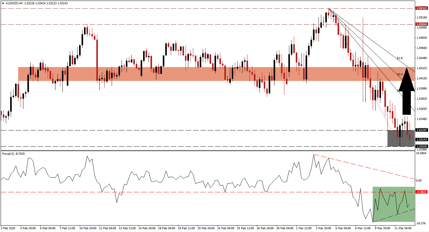 New Zealand finance minister Robertson admitted the economy has yet to face the impact of Covid-19, designated as a global pandemic yesterday by the World Health Organization. The delayed response could increase short-term pressures on the New Zealand Dollar, providing a fundamental catalyst for the AUD/NZD. A recovery into its short-term resistance zone located between 1.04112 and 1.04340, as marked by the red rectangle, and enforced by its descending 61.8 Fibonacci Retracement Fan Resistance Level is expected to unfold. More upside will require a new catalyst but remains a possibility.