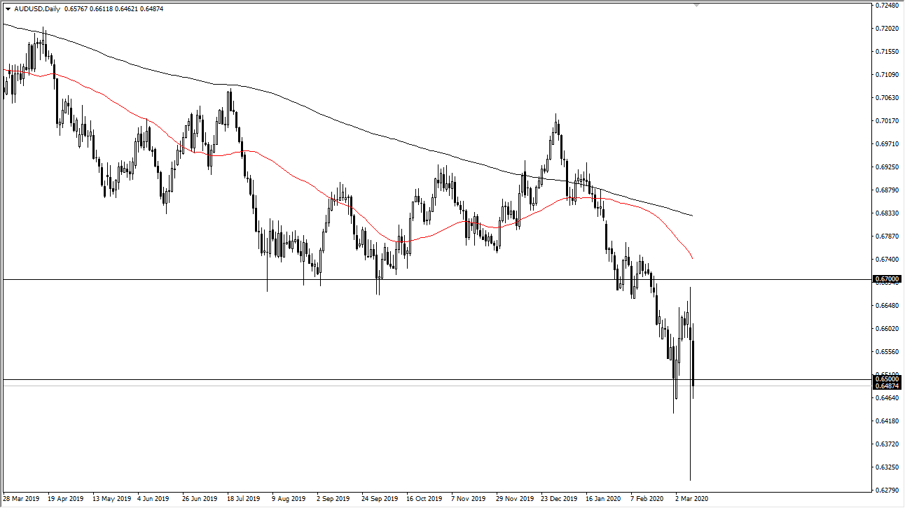 The Australian dollar broke down a bit during the trading session on Tuesday again to reach down below the 0.65 level. That’s an area that of course is a large, round, psychologically significant figure and it’s also possible that after the massive hammer that formed during the trading session on Monday, that could be plenty of support. Ultimately, this is a market that continues to see a lot of volatility, as the Australian dollar is a proxy for China and all things growth related. Ultimately, this is a market that is trying to build a bit of a base, but it may take some time to make that happen. The 0.63 level underneath has been massive support going back to the financial crisis, so it’s very unlikely to get broken without some type of major breakdown again in risk appetite.