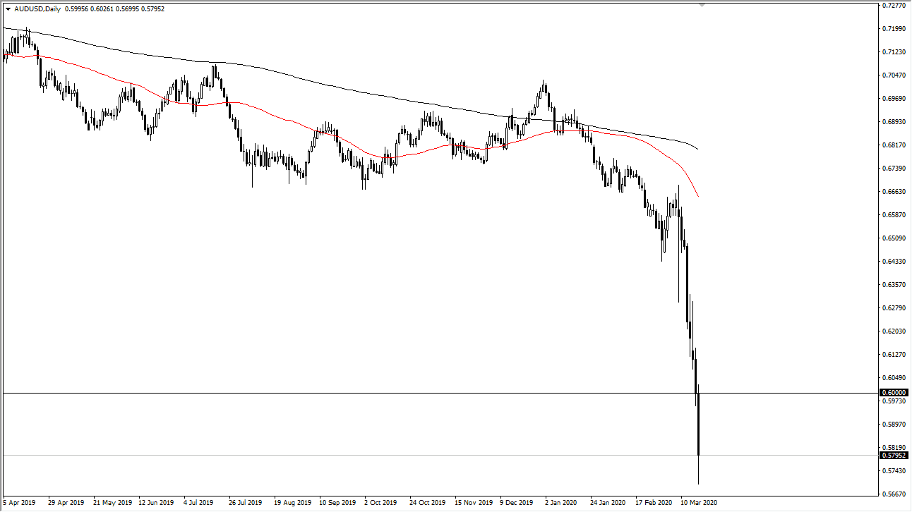 The Australian dollar has broken down significantly during trading on Wednesday, slicing through the 0.60 level in what can only be described as a major meltdown. Ultimately, the Australian dollar has suffered at the hands of the global slowdown, and it should be noted that we are now below the financial crisis lows. This is an overextension by any measure, but clearly you can’t be a buyer here. Granted, one day this will be a major “buy-and-hold” scenario, but not right now.