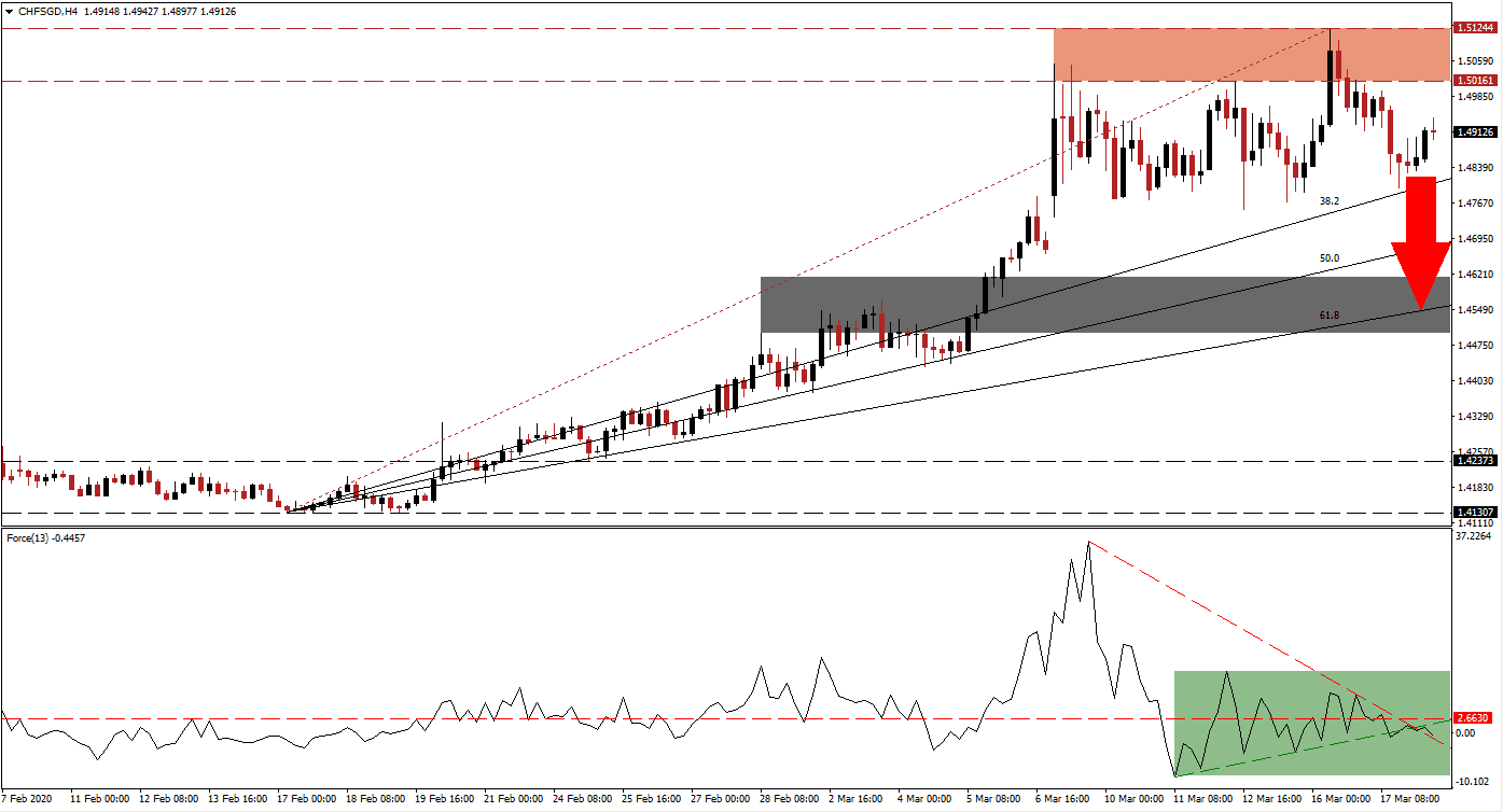 Following the initial breakdown in the CHF/SGD below its resistance zone, the bullish trend significantly weakened. This zone is located between 1.50161 and 1.51244, as marked by the red rectangle. Price action rebounded after reaching its ascending 38.2 Fibonacci Retracement Fan Support Level, but momentum remains depressed. The Swiss National Bank is favored to increase direct interference in the Forex market in an attempt to prevent uncontrolled appreciation in the Swiss Franc. Singapore’s Prime Minister warned the economic impact from Covid-19 on its economy will be more severe than during the last global financial crisis.