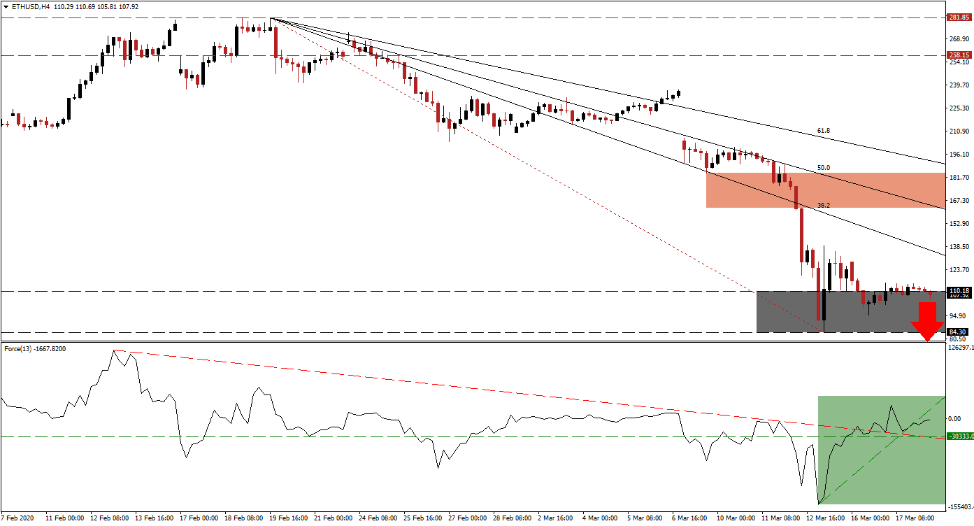 In the event of a sustained breakout in the Force Index above its ascending support level, the ETH/USD could experience a short-covering rally. The upside potential is limited to its descending 50.0 Fibonacci Retracement Fan Resistance Level, which crossed below its short-term resistance zone. With a global recession looming and more selling across equity markets, any spike in price action should be considered an outstanding selling opportunity.