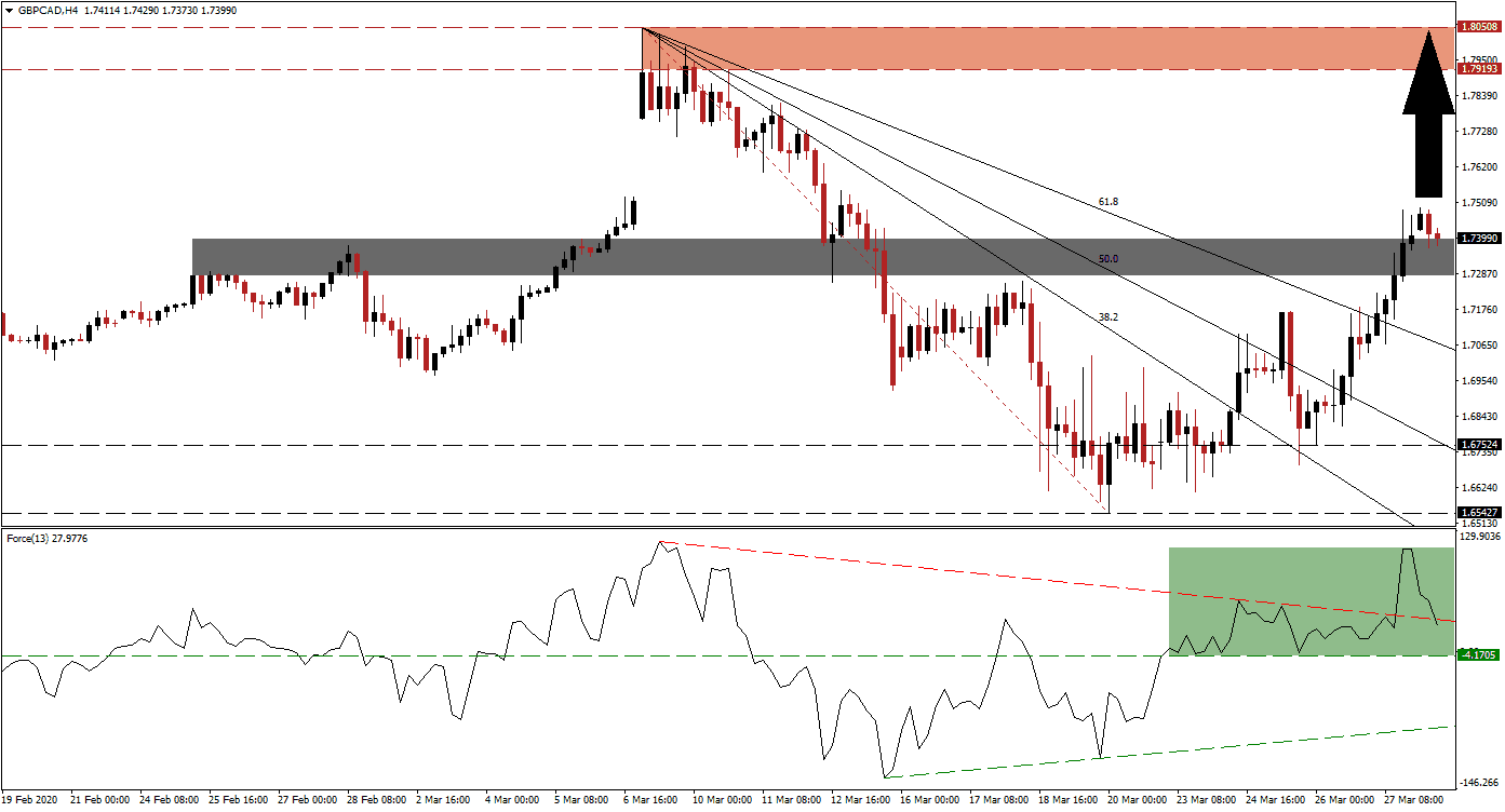 This currency pair is currently confirming the conversion of its short-term resistance zone into support, which is located between 1.72818 and 1.73954, as identified by the grey rectangle. The breakout in the GBP/CAD above its descending 61.8 Fibonacci Retracement Fan Resistance Level, converting it into support, resulted in a significant bullish catalyst. Canada is faced with economic problems from the Covid-19 pandemic and the collapse in oil prices. It additionally operates from a weak fiscal platform, adding downside pressure to the Canadian Dollar.