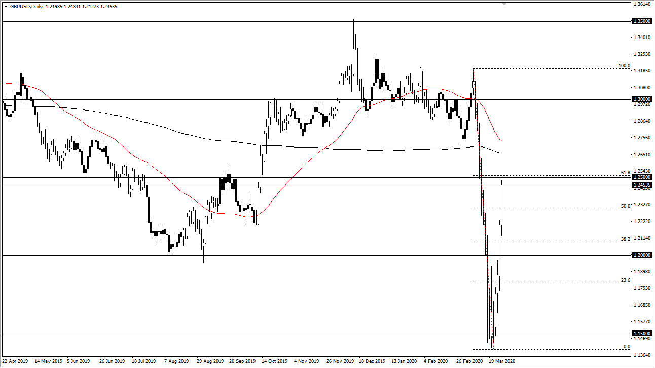 One of the hardest things to figure out looking at this chart is whether or not the search late in the day of the British pound was based solely upon people willing to step in and pick this market up, or if it’s simply a matter of US longs closing out in the stock market. It was very thin trading it is difficult to imagine a scenario where everybody wants to own the Pound in this environment. After all, the United Kingdom is most certainly going to struggle going forward. Granted, the Federal Reserve has decided to flood the market with liquidity and then should weigh upon the US dollar but to move 1000 pips in a week is beyond ridiculous.