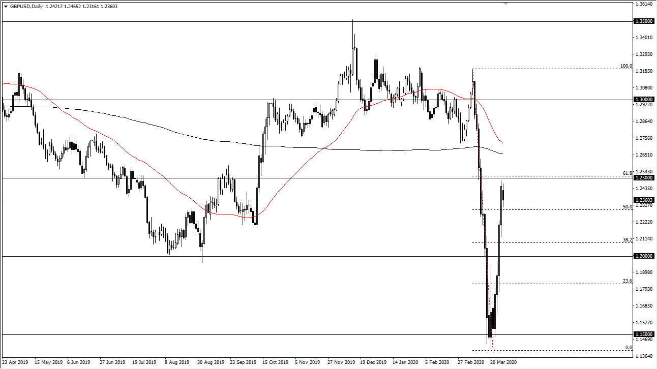 To the downside, if we were to break down below the lows of the session for Monday, then the market will more than likely go looking towards the 1.20 level. I think that is probably a little bit easier of a trade to take then buying, but if we were to break above 1.25 significantly, is very possible that the 200 day EMA will be targeted right afterward. Looking at the chart, you can see that we are overextended, and although there has been a significant move to the upside over the last week or so, the reality is that Great Britain is very likely going to continue to be suffering an economic slowdown while the rest of the world may choose to purchase US dollars in order to find a bit of a safety. That being said, it makes perfect sense to simply wait for some type of move in the market to follow. In this environment, you can get hurt rather quickly if you try to anticipate something.