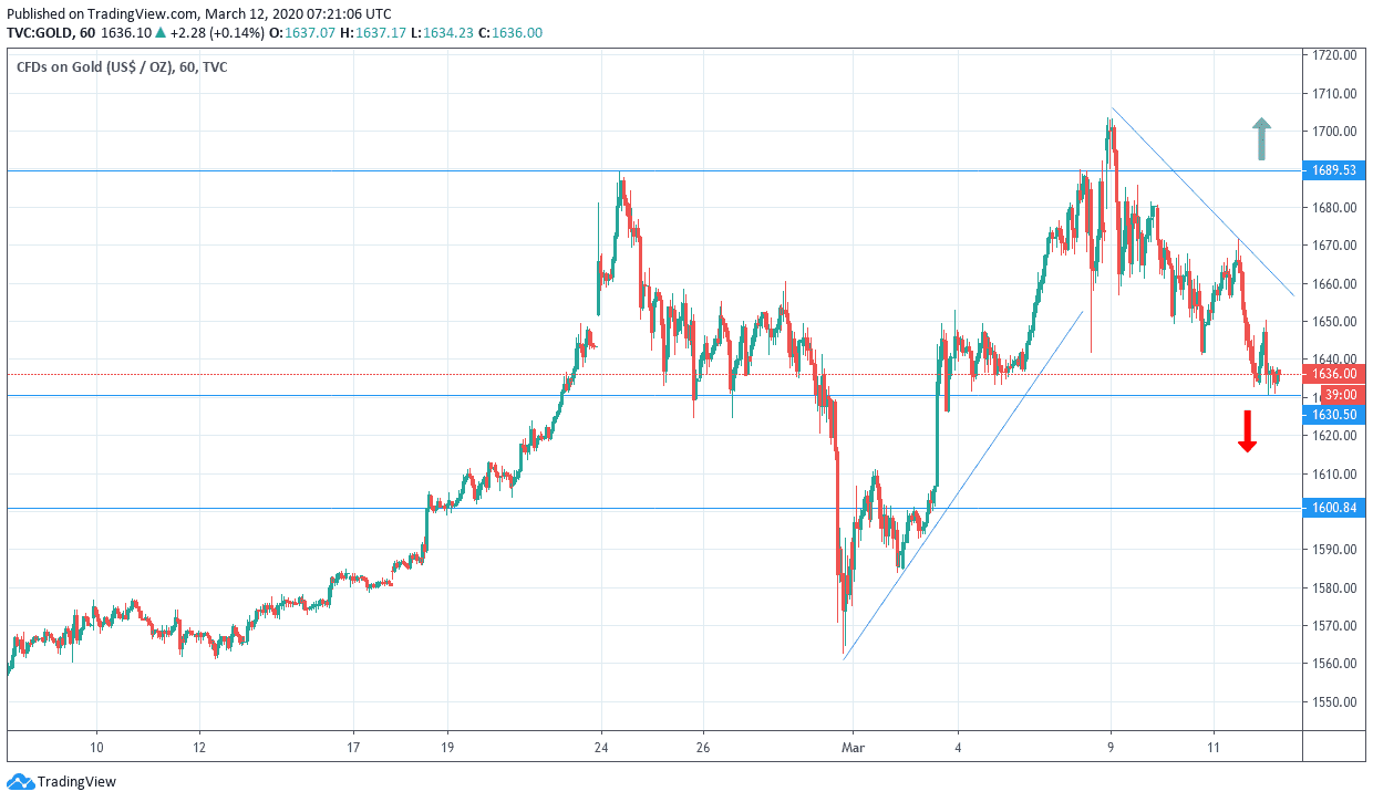 The recent corrections of gold price pushed it towards the $1631 support before settling around the $1636 level at the time of writing, awaiting for the return of buyers. The price of gold fell from the $1703 resistance, which was recorded at the beginning of the week amid growing fears of the global economy entering in a strong recession after the Coronavirus became a global epidemic, and no one was excluded, whether the economy was advanced or developing, although advanced economies were the most affected. Unusually, the path of gold rising was halted by rapid and successive steps and measures by global central banks and governments to stimulate the global economy in the face of Coronavirus consequences.