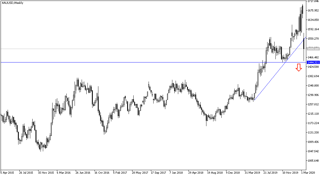 According to technical analysis of gold: The downward pressures of gold remain with the weak liquidity in global financial markets, which is the strongest explanation for the recent collapse of gold prices, despite the Coronavirus continued panic in the world and financial markets. Therefore, gains may remain selling targets at the present time, as returning to the natural liquidity of the markets after the recent heavy losses may take more time. Therefore, resistance levels at 1545 and 1600 may be selling targets if gold reaches there. What will increase the bears' control over the performance is the move towards the $1400 psychological support. From there below, there will be serious thinking of strong purchases.