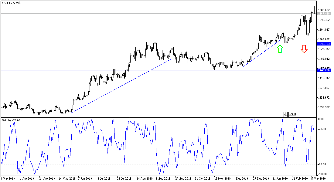 Last Friday's trading session saw the most fluctuating performance of gold in the recent period, with increasing concerns about the exposure of the largest economy in the world to what happened in China after increasing cases of death and infection in the United States. Recently, Gold prices rushed towards the $1690 resistance, the highest in seven years, and with the announcement of better-than-expected numbers for US jobs, the price of gold soon fell to the $162 support, but soon returned again to the ascending channel, and pushed from this support towards a higher resistance level at $1692 before closing the week's trading around $1674. At the beginning of this week's trading, the price gapped higher towards the $1703 resistance, before settling around $1665 at the time of writing. The yellow metal is still the biggest gainer since the COVID-19 epidemic broke out globally. The US stock markets did not benefit much from the positive US job numbers because investors want to know the numbers for the month of March, which reflects more the beginning of the epidemic in the country.