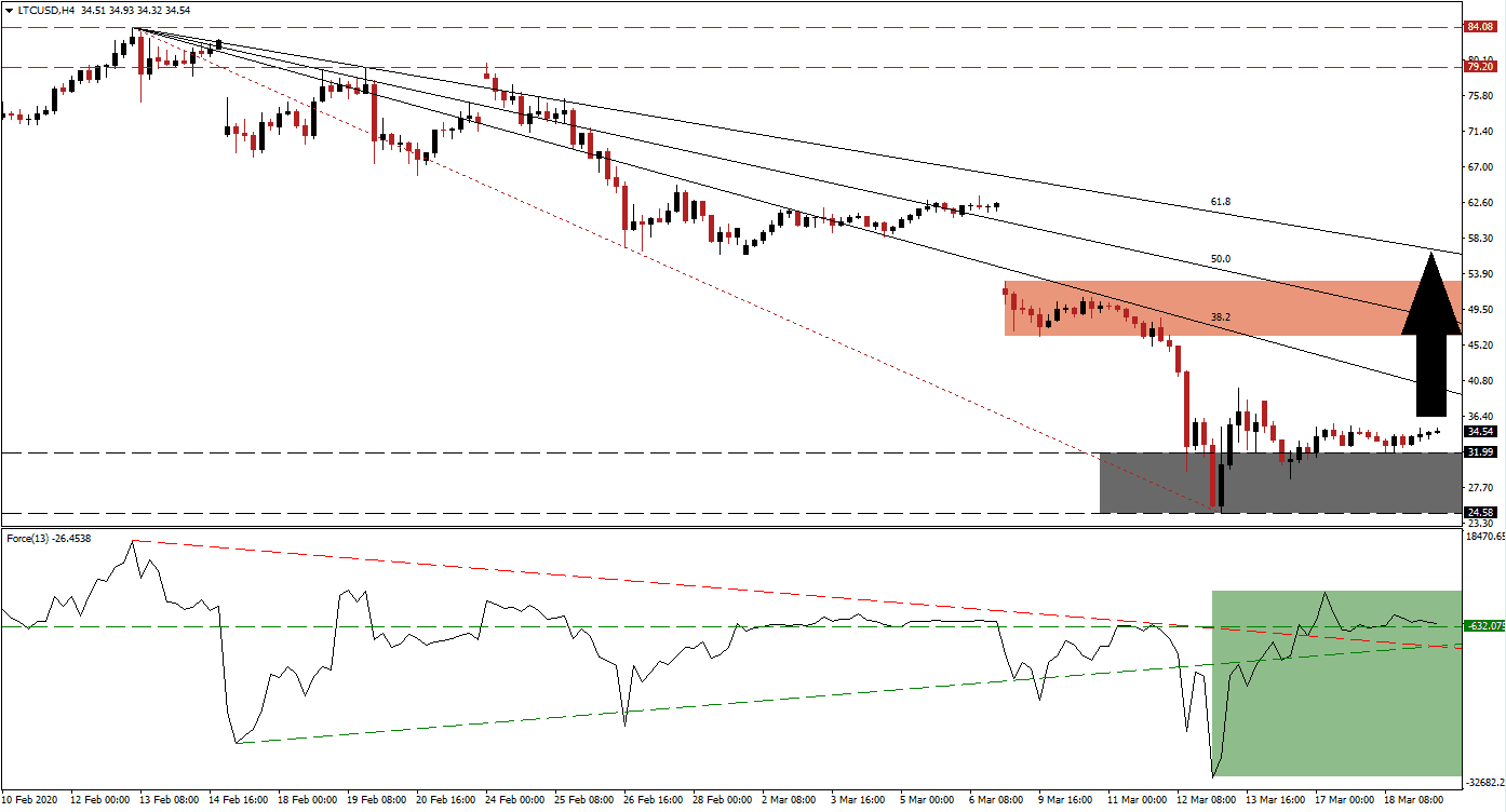 Margin calls related to the collapse across the financial system forced institutional selling in non-core assets like the cryptocurrency market. The bulk of selling pressure passed, but depending on global equity markets, numerous assets may face extended bearish conditions. Bitcoin and Ethereum carry the most significant downside risk. The LTC/USD has a host of positive fundamental developments favored to ignite a price action recovery. After price action pushed out of its support zone located between 24.58 and 31.99, as marked by the grey rectangle, more upside is expected.