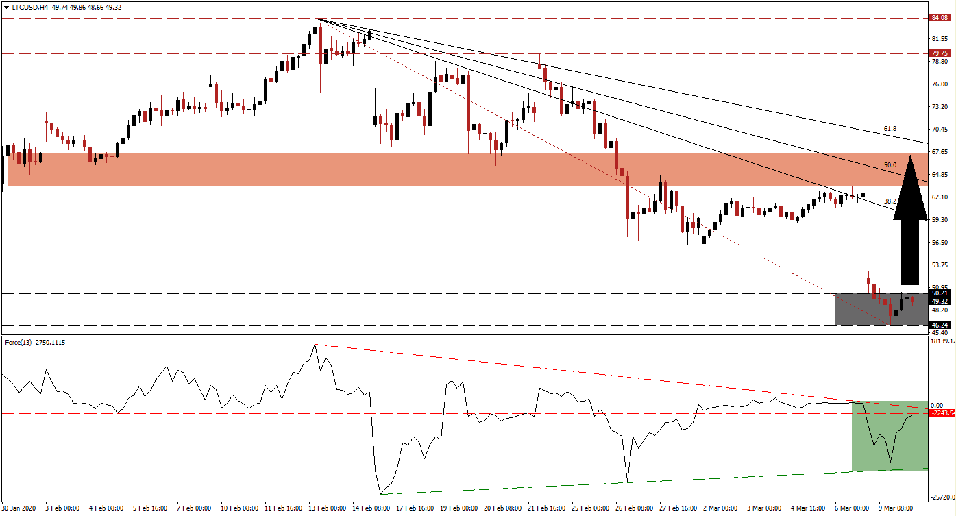 Over the past few trading sessions, doubts over the interconnectivity of the cryptocurrency market, and the global financial system, were eliminated. Bitcoin failed to follow the uptrend in gold as a safe-haven asset during financial turmoil. A collapse across the sector in response to yesterday’s oil price crash followed. The LTC/USD opened with a massive price gap to the downside, which took it into its next support zone before stabilizing. You can learn more about a price gap here.