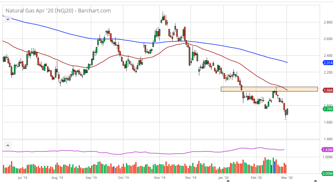 While that is probably going to be very unlikely, the reality is that the market believes it for the moment. A cheaper dollar suggest higher commodities, but it also could drive the idea of a market that should see the economy stretch a bit, as they flood the economy with money, the idea is that more economic expansion happens. That then in theory should drive up demand for natural gas. Obviously, this won’t actually work but it is the correlation that a lot of traders will look towards. At this point, we are oversold so a bit of a bounce makes quite a bit of sense also. Looking at the natural gas markets, they have major issues, not the least of which is going to be the fact that they are oversupplied. Furthermore, the weather isn’t going to be working in favor of higher natural gas prices either, as we have seen far too much in the way of supply to think that any type of demand is going to wipe it out. We need to see some type of major slew of bankruptcies in the United States when it comes to natural gas suppliers and drillers to see a real surge for a longer-term move.