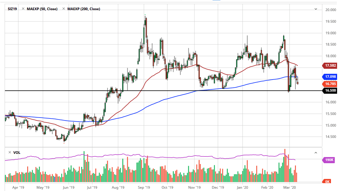 Recently, we have seen a lot more in the “pairs trade” than previously. In other words, people have been buying gold and shorting silver, allowing the market to make money via that spread. That being said, it isn’t that silver can’t rise, it’s just that the lack of industrial demand is going to hamper that in this environment. If the coronavirus continues to keep people indoors and workers away from work, it’s difficult to imagine a scenario where silver takes off to the upside. All of that being said, if the market were to break above the 200 day EMA, it will probably go looking towards the 50 day EMA which is colored in red, so at this point expect a lot of volatility and needless to say, downward pressure in an environment that simply does not favor industrial battles. Copper is very much the same right now, although silver does have somewhat of a precious metal aspect of it so at least the selling isn’t overly drastic or aggressive. At this point, it’s probably easier to simply sell short-term rallies.