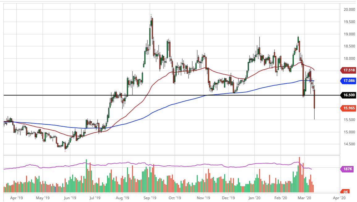 Obviously, this is a market that the sellers got a hold of during the trading session on Thursday, breaking through the psychologically and structurally important $16.50 level. This was an area that if we were to break down below, it signaled bad things. I said that we could go down to the $16.00 level, perhaps even down to the $15.50 level after that. Ultimately, this is a market that broke down rather stringently so I would not be surprised at all to see a little bit of a recovery on Friday, but I don’t know that I would be a buyer of the considering that the markets have seen so much in the way of volatility and of course negativity. If the industrial demand isn’t going to be there, the “safety bid” won’t matter. Furthermore, we are seen quite a bit of US dollar strength, and that is a major headwind for silver as well.