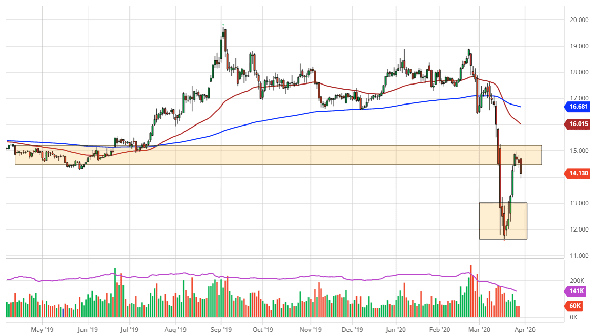 Looking at the chart, you can see clearly that silver has suffered at the idea of with almost no industrial demand out there, and quite frankly I don’t see that happening in the short term. The volatility of this market will continue due to the fact that there is the component of precious metal in the trade, and of course should be strong, but at the same time the lack of industrial demand is going to be very negative for this market, so having said that it comes down to whatever the market is focusing on. At this point, it certainly looks more negative than positive, so with that being the case it’s likely that the market will continue to see sellers on short-term rallies more often than not. That being the case, I don’t think about buying until we at least get down to the $13.00 level or get that daily close above the $15.00 level above that shows signs of increasing strength in demand.