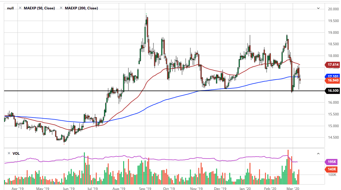 The $16.50 level should offer plenty of support, an area that has been important more than once. Because of this, the market is likely to respect this level, but if we were to break down below the $16.50 level it could open up the door down to the $16.00 level. On shorter-term charts, $16.50 has caused quite a rally, just as the $17.50 level has been significantly resistive. The $17.00 level is the scene of the 200 day EMA and therefore it looks as if it is also “fair value” for the market in general. With that being the case, you can also employ some type of “reversion to the mean” when it comes to trading this market based upon that fact in and of itself. If the market were to break above the $17.50 level, then it would be free to go much higher but, in the meantime, it’s going to be difficult to put too much money into this market as it will certainly go back and forth rather violently at times.