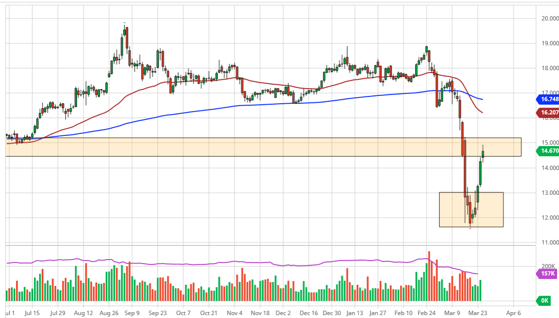 Silver markets did have a bullish trading session during the Wednesday hours, but as you can see the $15.00 level has offered quite a bit of resistance and therefore, we do pull back from that region. Ultimately, this is an area that will determine a lot going forward, because a break above the $15.00 level would be a move towards the $16.00 level just waiting to happen. Keep in mind that although silver is rallying right along with gold, the reality is that the market is also highly sensitive to the industrial demand. It is going to be interesting to see how this plays out, because the stimulus could, at least in theory, drive up the use of silver, but the coronavirus slowdown will continue to keep a lot of resistance on this market.