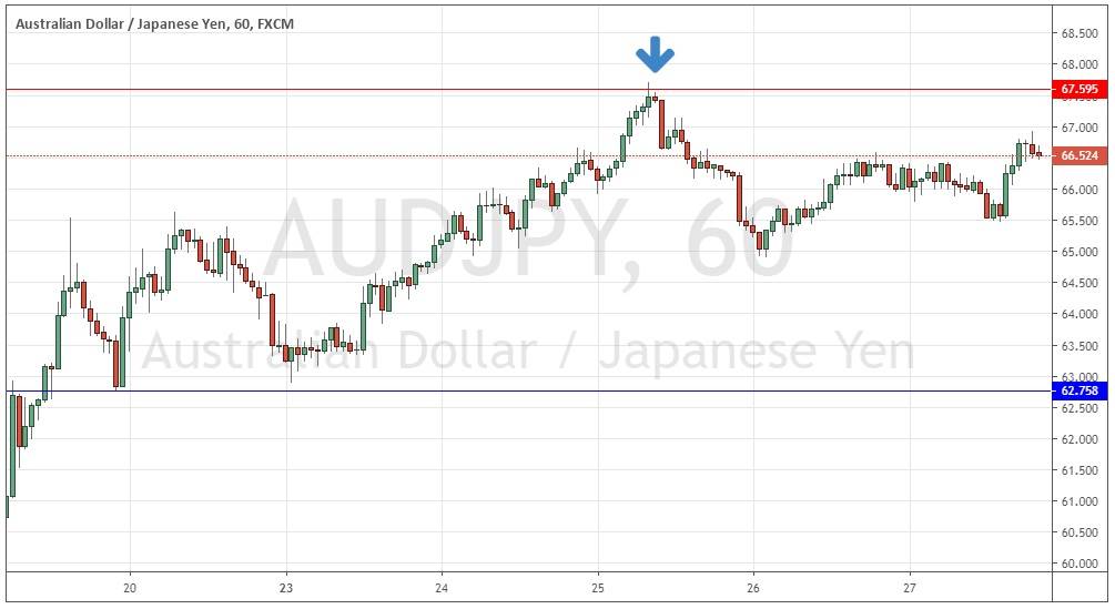 We had expected the level at 67.60 might act as resistance, as it had acted previously as both support and resistance. Note how these “flipping” levels can work very well. The H1 chart below shows how near the beginning of last Wednesday’s London session, the price bounced strongly off that level, forming a bearish inside candlestick marked by the down arrow in the price chart below, which immediately broke to the downside. This trade has given a maximum reward to risk ratio so far of just a little more than 8 to 1.