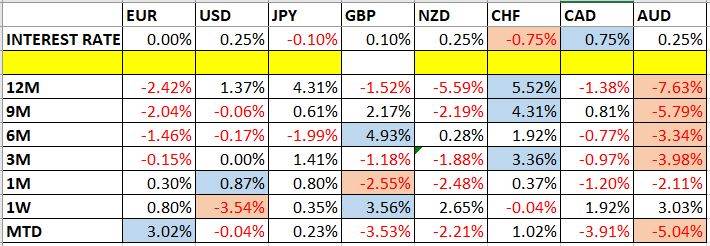 Let’s look at the relevant data of currency price changes and interest rates to date, which we compiled using a trade-weighted index of the major global currencies: