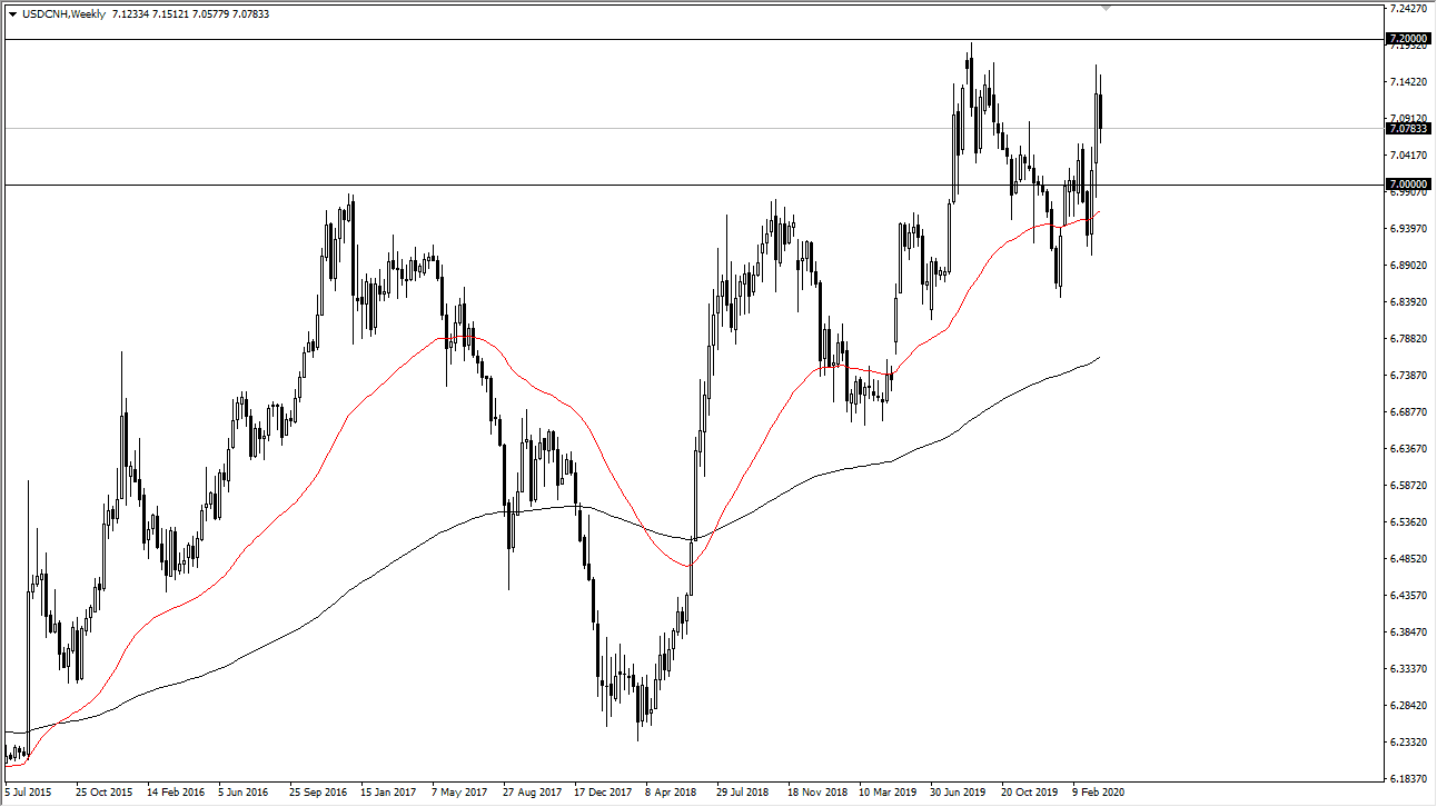 What this tells me is that it’s very important to watch the recent highs near the 7.20 CNH level. This is an area that if broken during the month of April, it’s very likely that it will kick off a lot of panic in risk appetite. If that’s going to be the case, then if you do not trade this currency pair, you can use it as a proxy to tell you what to do about such things as stock markets, indices, and the like. This would work against a lot of commodities, as it would show concerns about growth in general.