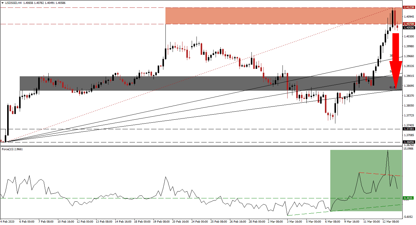 After the USD/SGD pushed below its resistance zone located between 1.40708 and 1.41238, as marked by the red rectangle, a profit-taking sell-off is anticipated. This zone dates back to August 2015 and developing fundamental conditions make a sustained advance highly unlikely. Forex traders rushed to the US Dollar amid liquidity concerns, and the US Federal Reserve announced $1 trillion in fresh capital, but the financial markets already dismissed it. With more stimuli awaited, the outlook for the US Dollar remains bearish.