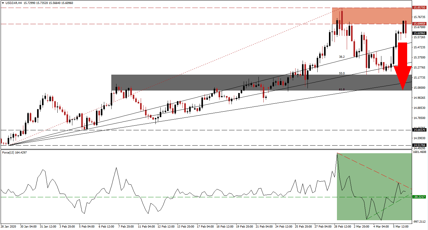 Following a new 2020 high in the USD/ZAR, the 50 basis point interest rate cut by the US Federal Reserve ended the advance. Nigeria has overtaken South Africa as the continent's largest economy after the latter posted a 1.4% GDP contraction in the fourth quarter. It resulted in the second recession for the South African economy in two years, driven by ongoing power outages related to Eskom’s inability to maintain the grid. The ripple effect has impacted neighboring countries as well. Issues in South Africa are known, but the US is at the start of economic disruptions, creating a bearish bias in this currency pair. The rejection of the recovery by its resistance zone is favored to lead to a profit-taking sell-off.
