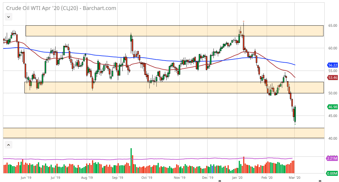 The crude oil markets are oversold to say the least, but I still think it’s only a matter of time before this market breaks down. Ultimately, this is a market that continues to see a lot of volatility but it’s a bit difficult to imagine a scenario where crude oil demand suddenly takes out. I think this is more or less just a sign that perhaps we had gotten a bit of head of ourselves. Furthermore, it’s a bit presumptuous to think that the economy is certainly going to turn around in order to drive up demand for crude oil. That being said, it’s also a bit presumptuous to think that the coronavirus is going to kill all demand for crude oil either.