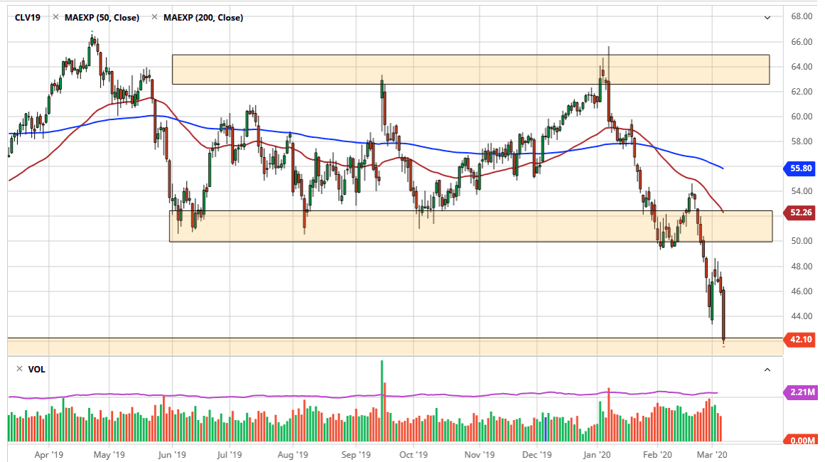It’s not until we break well above the $50 level that I would be willing to start buying. I think until then, all rallies are to be looked at as selling opportunities. I believe that most of the market feels the same way, and with the oversupply of crude oil out there, not only in OPEC stands but around the world, it’s going to be difficult for crude to take off to the upside. The coronavirus reaching through economies and slowing down movement should suggest that demand will only fall from here, and thereby we need to find equilibrium at a lower level. Based upon the parish flag, the measured move is down to the $35 level. That doesn’t mean we get there tomorrow, but the way things have been acting recently, it’s not a huge surprise to see the crude oil markets do just that. Crude oil seems to be helpless at this juncture.