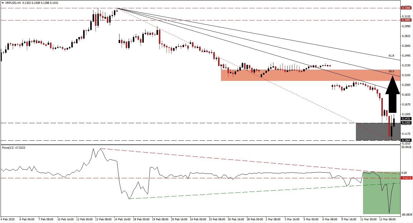 The Force Index, a next-generation technical indicator, plunged to a new 2020 low and confirmed the massive price collapse in this digital asset. It has now spiked higher and reclaimed its ascending support level, as marked by the green rectangle. The Force Index is expected to push through its horizontal resistance level, converting it into support, before challenging its descending resistance level. A crossover in this technical indicator above the 0 center-line will place bulls in charge of the XRP/USD. You can learn more about the Force Index here.