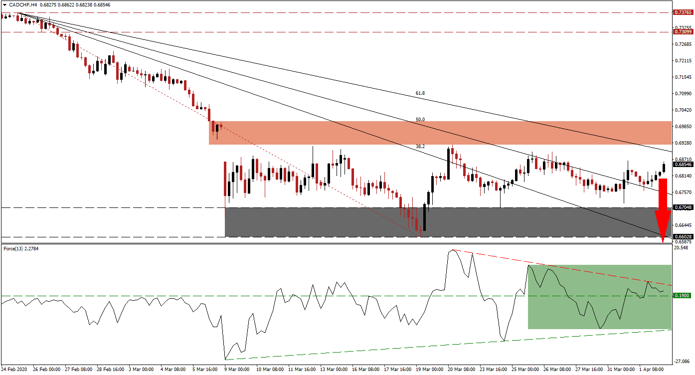 With the 61.8 Fibonacci Retracement Fan Resistance Level below its short-term resistance zone located between 0.69219 and 0.70025, as identified by the red rectangle, the CAD/CHF is exposed to more selling. Canada boosted its stimulus to C$202 billion after initial jobless claims spiked by a record-breaking 929,000 last week. The Bank of Canada announced an unprecedented bond-buying program of a minimum C$5 billion per week, while interest rates were slashed to 0.25%. Breakdown momentum in this currency pair remains elevated due to the increase in debt mixed with a weak economic outlook.