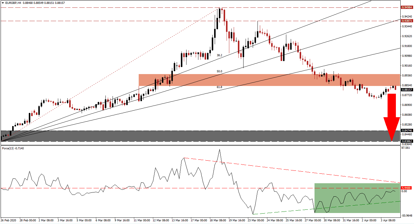 Economic data out of the Eurozone has been dismal, as evident in March PMI readings. While UK data has confirmed the disruptions caused by the global pandemic, the kingdom is well-positioned to bridge the period to economic recovery with a unified response. The EU continues to struggle with internal rifts, a scattered response, and a lack of unity. Before the virus, the Eurozone struggled with the global slowdown, now expected to mature into a recession, while the UK was on solid ground. The EUR/GBP is favored to accelerate into its support zone located between 0.83862 and 0.84746, as marked by the grey rectangle. A breakdown extension is likely to follow and lead to a new 2020 low.