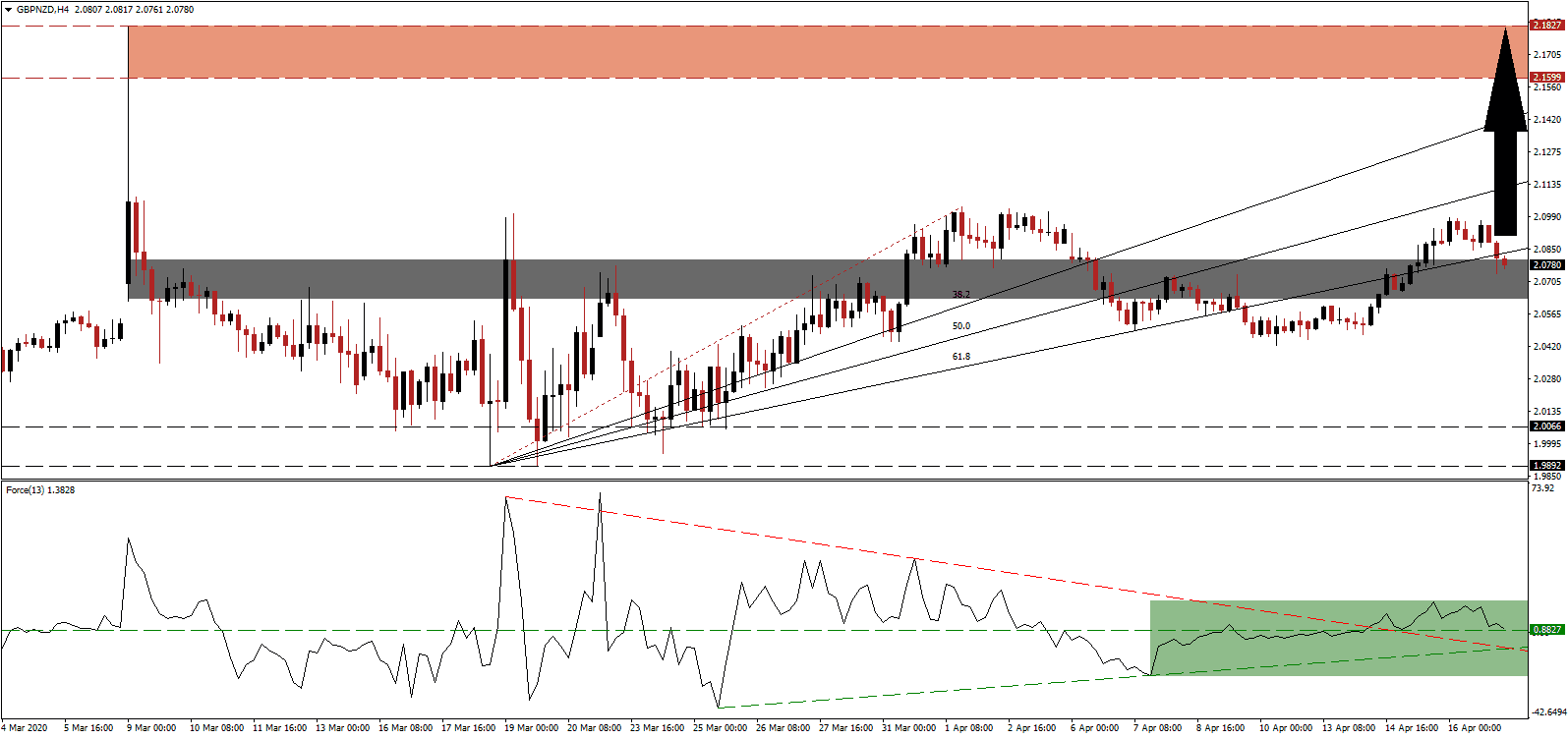 The Force Index, a next-generation technical indicator, bounced off of its ascending support level and a higher low. After converting its horizontal resistance level into support, bullish momentum sufficed to elevate the Force Index above its descending resistance level. This technical indicator remains in positive territory, as marked by the green rectangle, with bulls in control of the GBP/NZD. More upside is expected to materialize.