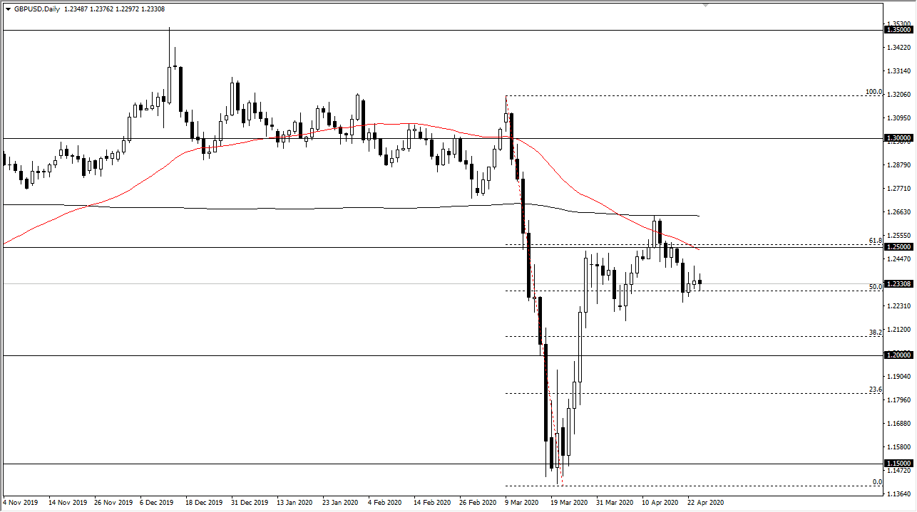 To the upside, the 50 day EMA should offer a lot of resistance, and the fact that we ended up forming a couple of inverted hammer’s suggests that we are ready to go lower. If we do break above the highs of the last couple of candlesticks though, that would be a bullish sign that has to be paid attention to. If we get a daily close above the 1.25 handle, then it is possible we break out to the upside. That being said, the British pound has a lot working against it, not the least of which will be the fact that the United Kingdom is going to be locked down much longer than many of the other countries around the world, not the least of which will be the United States that is already in the process of trying to open up certain areas in the next few days.