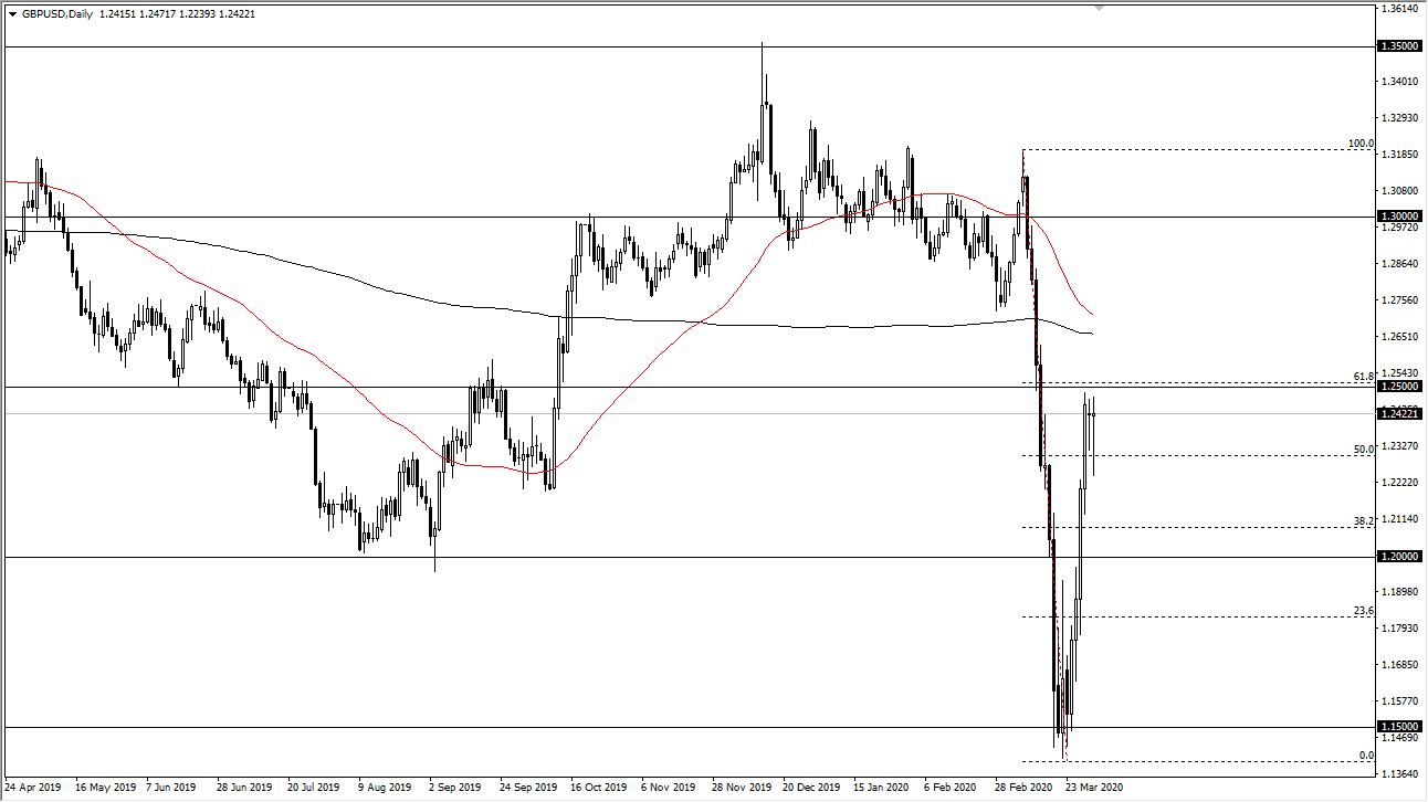 The British pound fell initially during the trading session on Tuesday but bounced significantly to turn around and reach towards the 1.25 handle again. This is an area that of course will capture a lot of attention due to the fact that it is a psychologically important figure, but the last couple of days have seen this market knocking on the door. If we can finally break above that level, it’s likely that the British pound will continue to take off and go looking towards the 1.2750 level initially. Keep in mind that the 61.8% Fibonacci retracement level is sitting just there as well, so it of course pays a lot of attention.