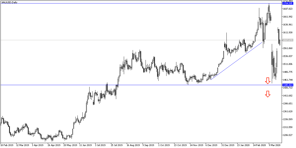 In an impressive move by investors in light of the worry that dominates global markets from the rapid spread of the deadly Corona virus in more than 175 countries around the world, during yesterday's trading session, the US dollar fell at a time when gold prices fell, and in the same path, US stocks fell. Gold prices fell to the $1570 level in the beginning of Wednesday’s trading and could not maintain the $1622 resistance during Tuesday's session. At the beginning of the week's trading, gains did not exceed $1626 dollars an ounce and it settled around the $1588 level at the time of writing. Gold futures fell, affected by US consumer confidence data, which came better than expected and with the announcement of higher Chinese manufacturing activity, despite the decline, but gold prices recorded gains for the monthly and quarterly performance on the back of concerns about the shock of the COVID-19. Consumer Confidence fell to a reading of 120 in March, from a revised 132.6 in February, but some expectations called for a decline to 115.