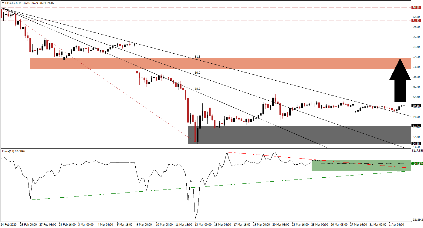 Price action may challenge its descending 61.8 Fibonacci Retracement Fan Support Level before extending its breakout sequence by accelerating into its short-term resistance zone. This zone is located between 52.94 and 57.20, as identified by the red rectangle. It includes a previous price gap to the downside. Volatility is favored to increase as the Covid-19 pandemic is forcing a global recession. Litecoin’s planned MimbleWimple privacy protocol testnet launch provides a floor under selling pressure in the LTC/USD, for the time being.