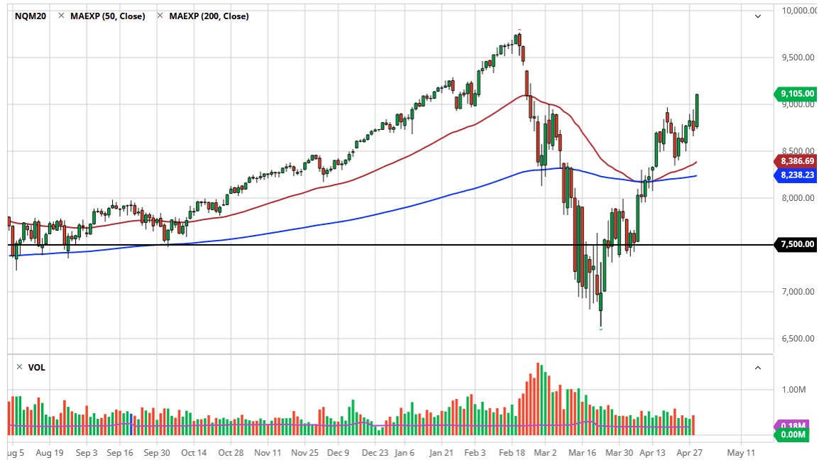 The NASDAQ 100 has cleared the 9000 level during the trading session on Wednesday, so it now looks as if we are going to reach towards the highs again. Quite frankly, the market even closed at the absolute top of the range, showing extreme amounts of bullish pressure. At this point, the market is likely to continue to see bullish pressure due to the fact that the Federal Reserve is more than willing to come in and bail everybody out. With that in mind, it is more of what we have seen over the last decade, stock markets ignoring reality as far as economics are concerned. I do believe that this market is probably going to go looking towards the 9500 level which features a gap.