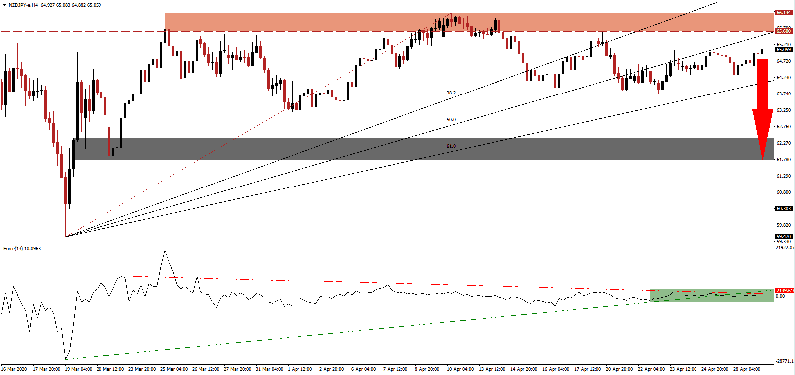 Following the Covid-19 pandemic, the global economy will reshape in a slow and painful process. It is neither reflected in minds nor financial markets. The Japanese Yen is set to benefit from the pending modifications due to its safe-haven status. Forex traders are advised to monitor the ascending 61.8 Fibonacci Retracement Fan Support Level, as a breakdown below it is favored to attract the next wave of sell orders. It will additionally provide the required volume for the NZD/JPY to accelerate down into its short-term support zone located between 61.750 and 62.429, as marked by the grey rectangle.