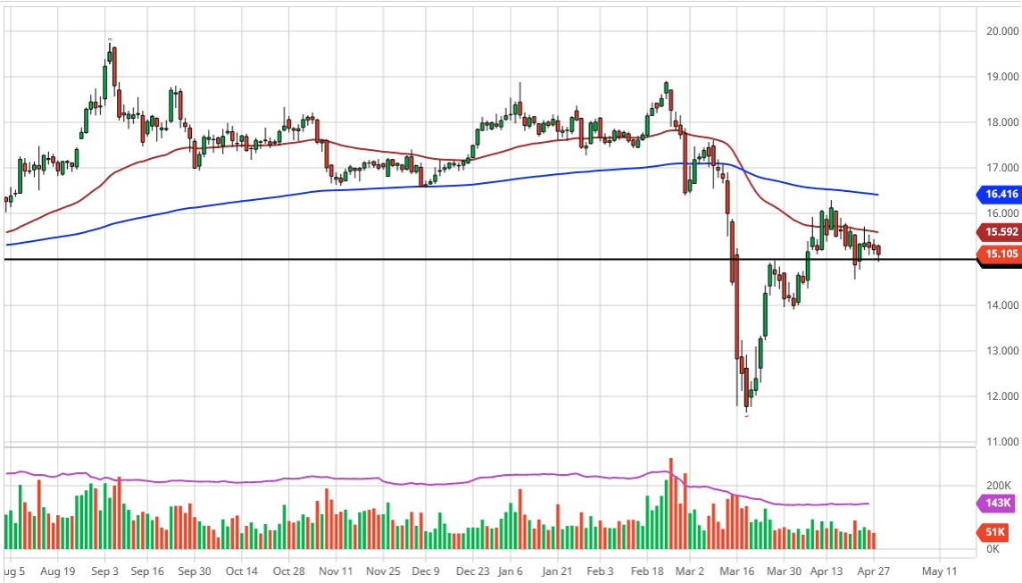 The previous candlesticks showed a deceleration of momentum, and I think we are going to see more of the same as this market simply has nowhere to be in the short term. Given enough time, I think that if we can break above the 50 day EMA, it is possible that the market goes looking towards the $16.00 level next, perhaps followed by the 200 day EMA at the $16.40 handle.