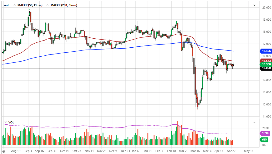 The $16.00 level above should be a massive psychologically important level, just as the 200 day EMA is starting to reach down towards that area. I think that given enough time we will probably break above there, but it may take several attempts to do so. The $14.50 level underneath should offer massive support, just as the $14.00 level should. I like the idea of buying dips and simply taken advantage of value as it occurs, but I do not do it in the futures market simply because it is so expensive. The volatility of course makes holding silver contracts exceedingly difficult, so keep that in mind. I like the idea of buying physical silver, but if you have the ability to trade CFD markets, you may find that to be a decent vehicle in order to trade this market. Because of this, you will have the ability to add slowly, just as somebody who is trading physical metal can do. With that being the case, it is likely that we will see more volatility than anything else, so make sure you can keep your stop losses relatively wide, as the markets are trading on pure emotion most days.