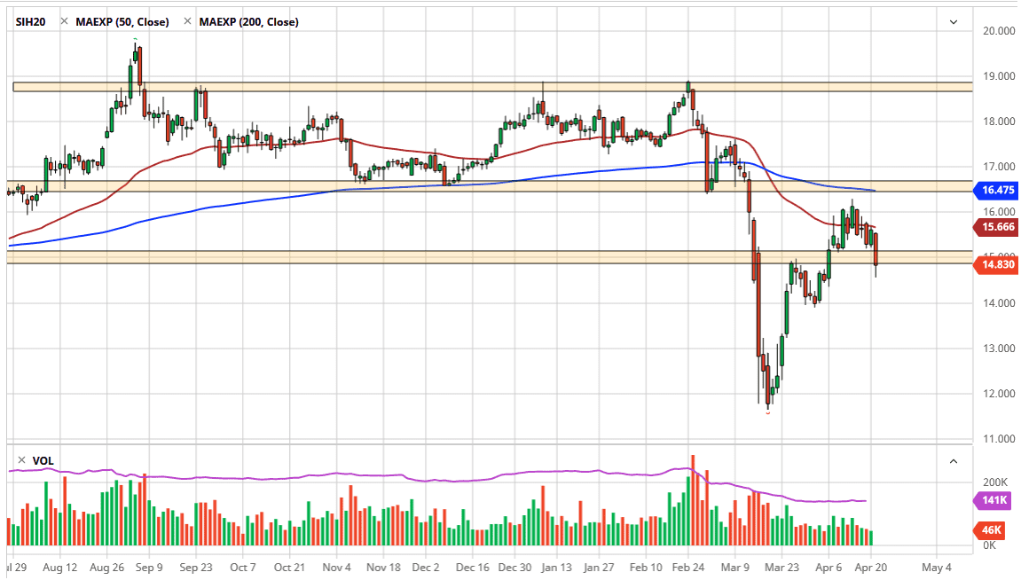 When you are trading, you have to be looking at both sides of the equation, as risk is the biggest part of the equation. I do recognize that precious metals have been getting a bit of a bid in this chaotic time, and I think that will continue to be the case going forward. That being said, the reason this market will probably lag a bit is that there is so much in the way of industrial components when it comes to the price of silver that will of course be a major headwind. The global economy continues to slow down so it makes sense that silver would drag on a bit as well. All things being equal, I believe that silver will continue to be bullish, but it will underperform gold as I have been saying for several weeks now. To the upside, be where the 200 day EMA at the $16.47 level.