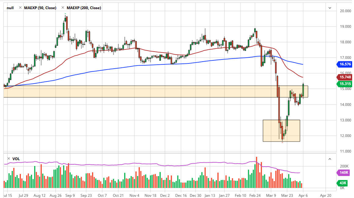 Silver markets have rallied significantly during the trading session on Monday, clearing above the $15.00 level, and perhaps even more importantly the 15 point to zero dollars level. This is a major breakout and signifies that silver is ready to go much higher. This coincides quite nicely with the stock markets which have rallied based upon a slowing of the coronavirus death rate. There is a bullish flag underneath and that’s a very bullish sign as well.