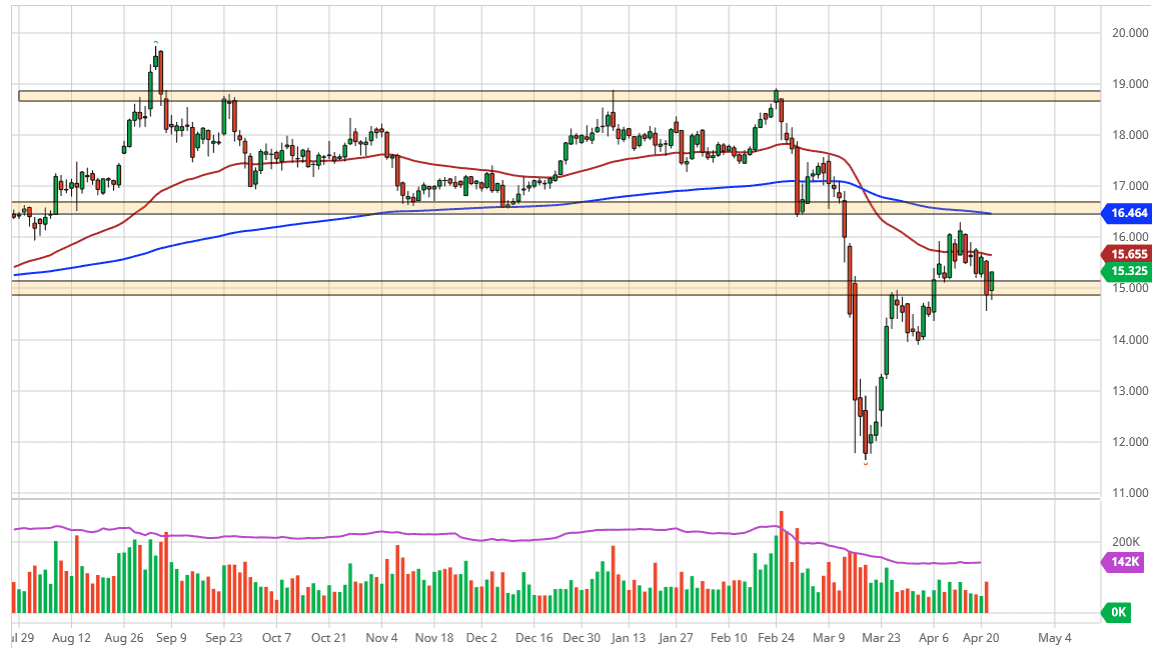 Going back to the drivers of silver, there is the obvious precious metals trade which works in a scenario where central banks around the world continue to throw money left and right, devaluing fiat currencies. It also works as a bit of a safety trade as well due to the precious metal aspect. However, one big problem that the silver markets have is that silver is also an industrial metal, so there is a certain amount of demand or perhaps even lack of demand when it comes to industry. At this point, industry is grinding to a complete halt, and I think it is very unlikely that the demand for silver is going to pick up anytime soon. A breakdown below the lows of the trading session on Tuesday could signify that we are going to test significant support underneath, so it is only a matter of time before we would bounce. On the other hand, the market should continue to see a lot of volatility and although I think that we are going to go higher, it is not necessarily going to be easy. If you want to buy the precious metals, gold will be the way to go.