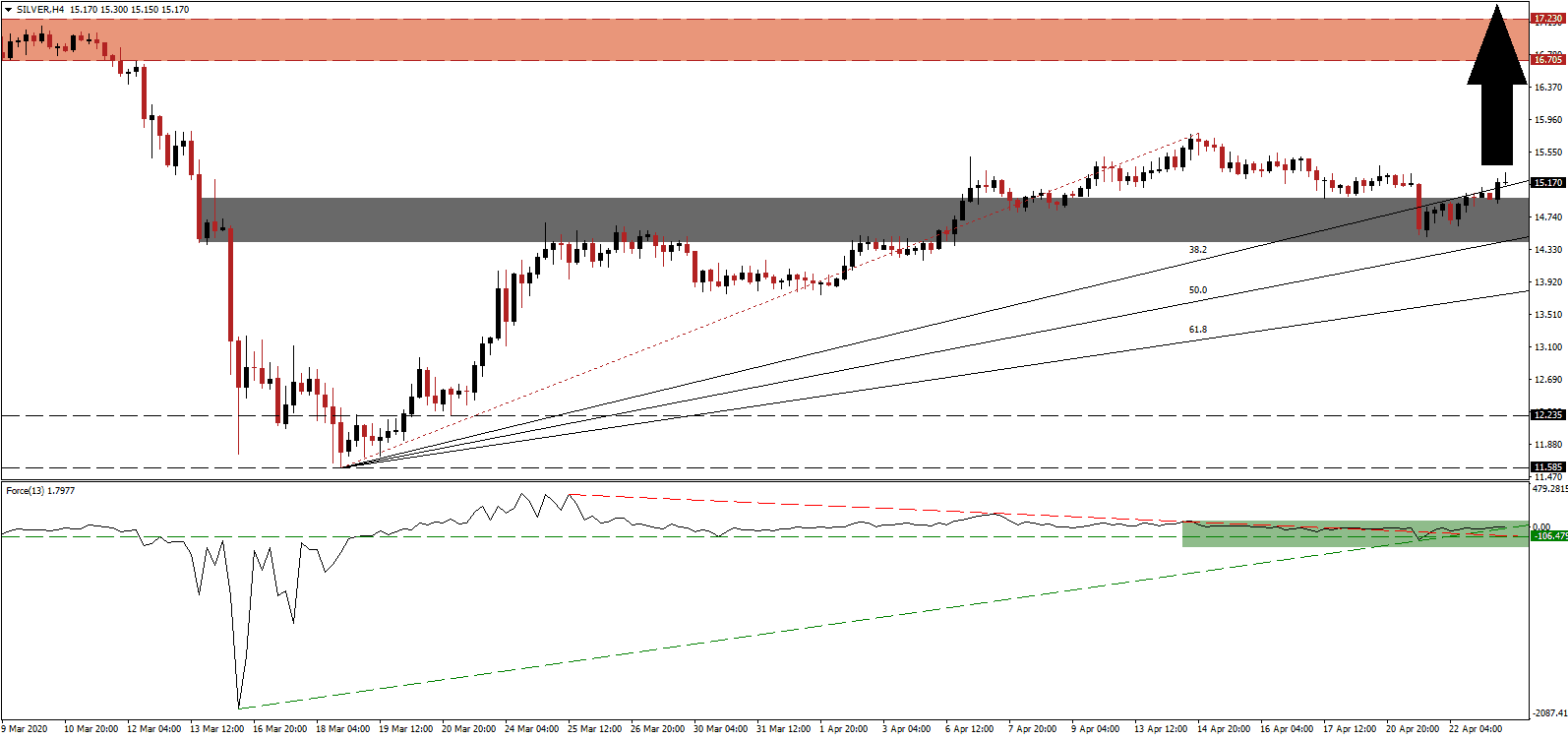 Preliminary PMI data for April out of France and Germany confirmed a significantly more massive collapse in economic activity. The attention for the remainder of today’s session lies with US initial jobless claims and PMI reports. Regional data indicate the same pattern evident across the Eurozone, positioning this precious metal for more gains. Silver is expected to advance into its resistance zone located between 16.705 and 17.230, as identified by the red rectangle. More upside is possible, supported by ongoing fundamental developments.