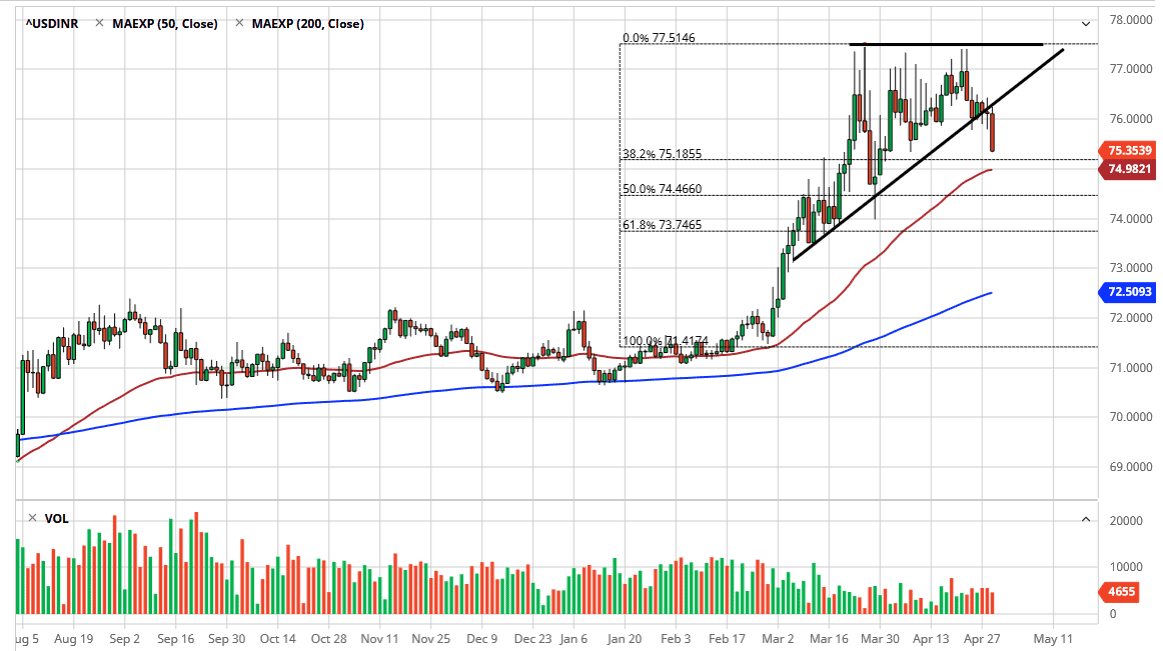 Looking at the chart, we are approaching the 75 Rupee level which will cause a certain amount of psychological support, and it should be noted that we also have the 50 day EMA coming into play just below there. In other words, if the market were to break down below that 50 day EMA, then at that point you would have a serious attempt at changing the overall trend. Do not be wrong, this move during the trading session on Wednesday was very ugly, and we are closing towards the bottom of the candlestick which gives me the idea that we could very well have some follow-through.