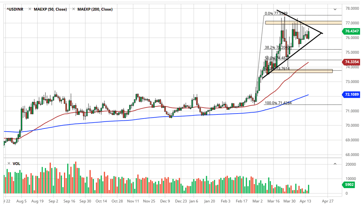 To the downside, if we were to break down below the bottom of the wedge then it’s likely that we could go down towards the 75 Rupee level where we will probably start to come into contact with the 50 day EMA, which of course is an indicator that will attract a lot of attention by traders as we are in a strong uptrend. Furthermore, you have to keep in mind that there is a lot of global fear out there and India is essentially locked down and entering its first recession in over 40 years. While the United States is going to be in a recession as well, the greenback tends to be more of a safety currency and of course there is high demand for the US treasury market right now, which continues to make lower yields. As long as that’s the case, it means that there are a lot of buyers out there when it comes to US bonds. All things being equal, I think that short-term pullbacks probably offer buying opportunities in this market, but as far as a big move is concerned, we need to break out of this wedge at the very least.