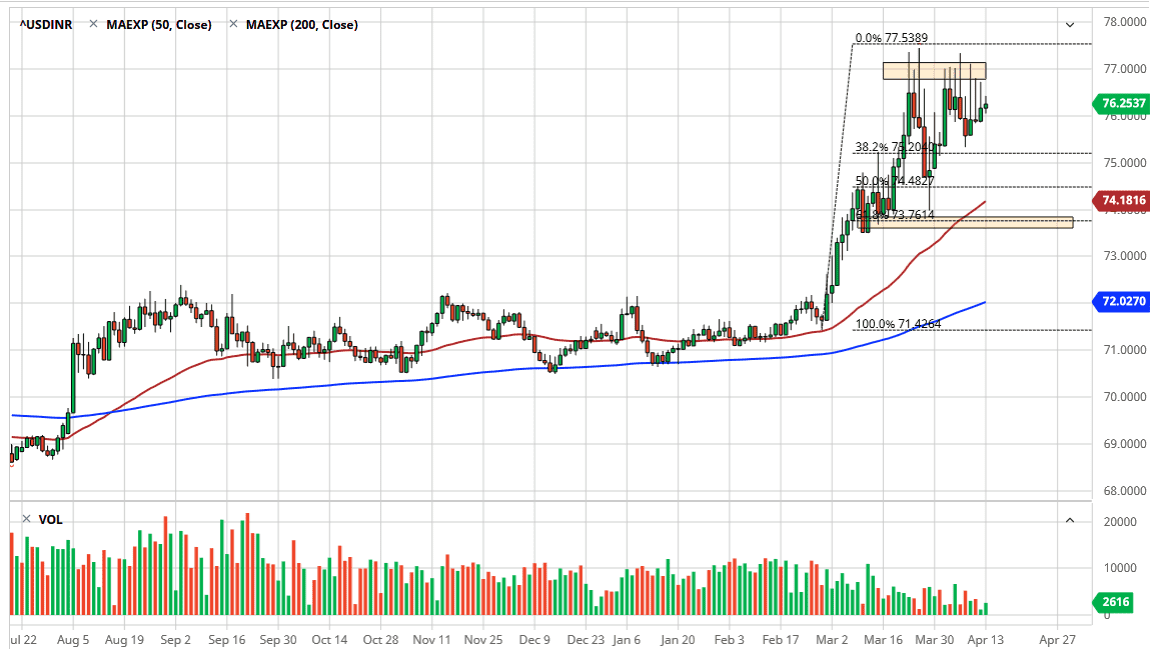 The US dollar has been relatively quiet against the Indian Rupee during the trading session on Monday but that’s not a huge surprise considering that a lot of the world’s largest banks were away from trading terminals when it comes to the currency markets. It was Easter Monday, and although it certainly doesn’t affect Indian banks, it does affect European Union banks and therefore a massive amount of liquidity.