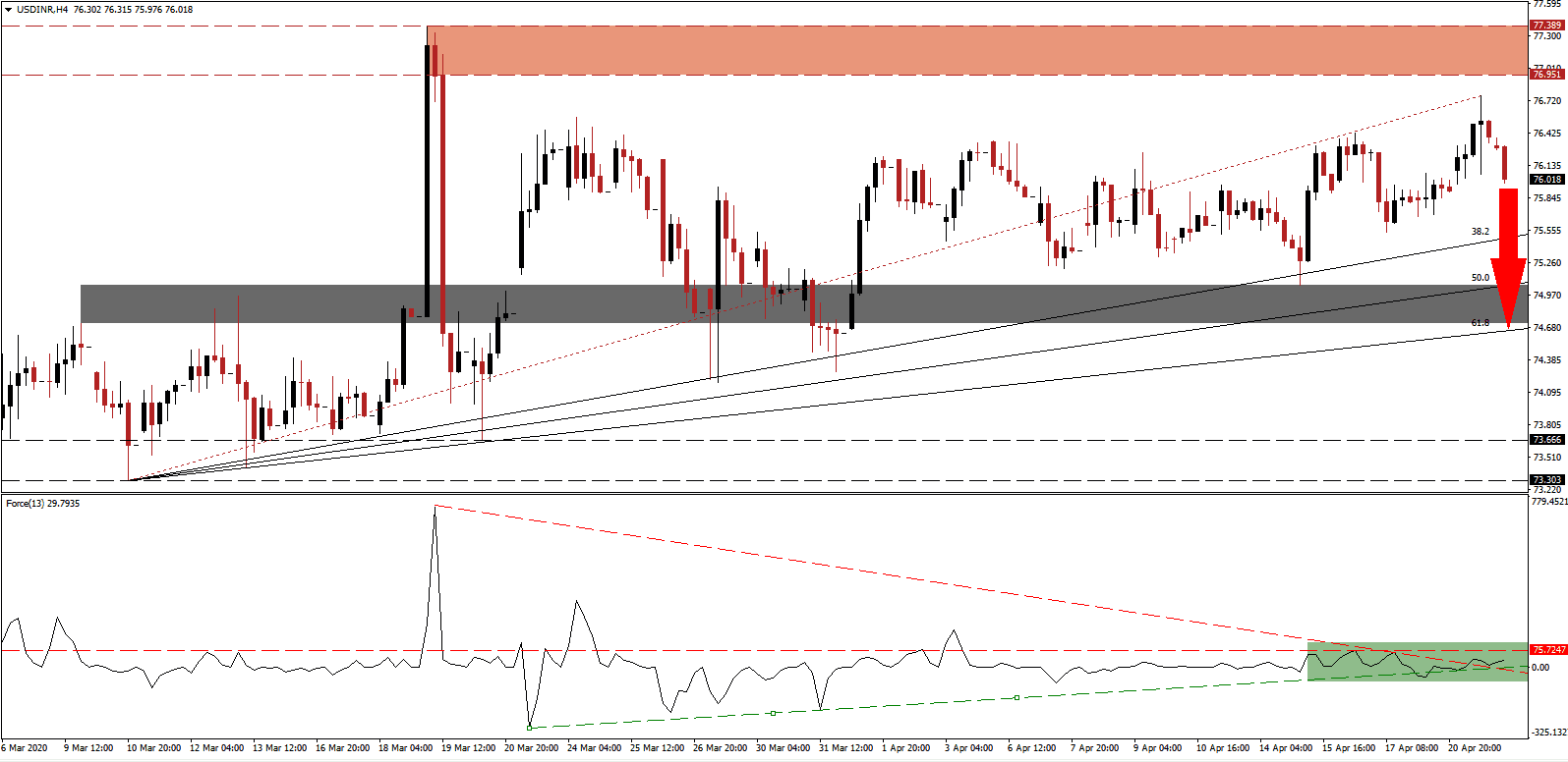 India’s 2021 fiscal year projection by the International Monetary Fund forecasts a 7.6% GDP expansion, while the 2020 fiscal year ending March 2021 is predicted to show a 1.9% growth rate. It assumes a series of extreme positive developments, making it vulnerable to disappointments. The global Covid-19 pandemic forced nationwide lockdowns across the world, but India reports a steady rise of infection. Over 20,000 confirmed cases were identified, and more are anticipated. The government announced a $22.6 billion stimulus to assist millions of daily wage earners who are unable to provide for their families, the majority active in the grey sector of India’s economy. Price action in the USD/INR is amid a correction after failing to reach its resistance zone.