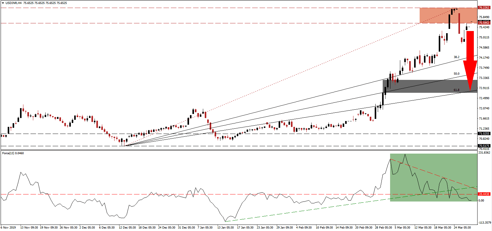By the end of April, the US is on track to report job losses above 30 million over two months. It represents over 40% more losses than total job creations since 2009. Markets underestimate the long-term negative impact on the US economy while continuing to call for an equally powerful reversal. This currency pair is well-positioned to accelerate down into is ascending 38.2 Fibonacci Retracement Fan Support Level. The pending corrective phase in the USD/INR may extend into its short-term support zone located between 72.7114 and 73.2406, as identified by the grey rectangle, and enforced by the 61.8 Fibonacci Retracement Fan Support Level.