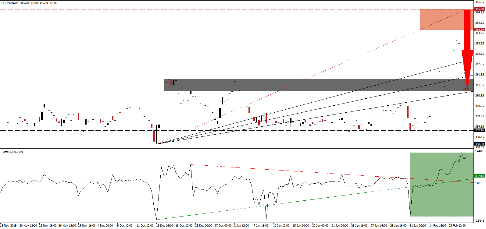 The Force Index, a next-generation technical indicator, spiked to a new 2020 peak, as marked by the green rectangle. Upside exhaustion, in combination with the lack of volume, is favored to pressure for a reversal into its horizontal support level. While the ascending support level is closing in, a breakdown extension into its descending resistance level cannot be excluded. Bulls are in control of the USD/NGN, but it is essential to consider that not all days witness trading activity in this currency pair. The last recorded trade was on April 6th.