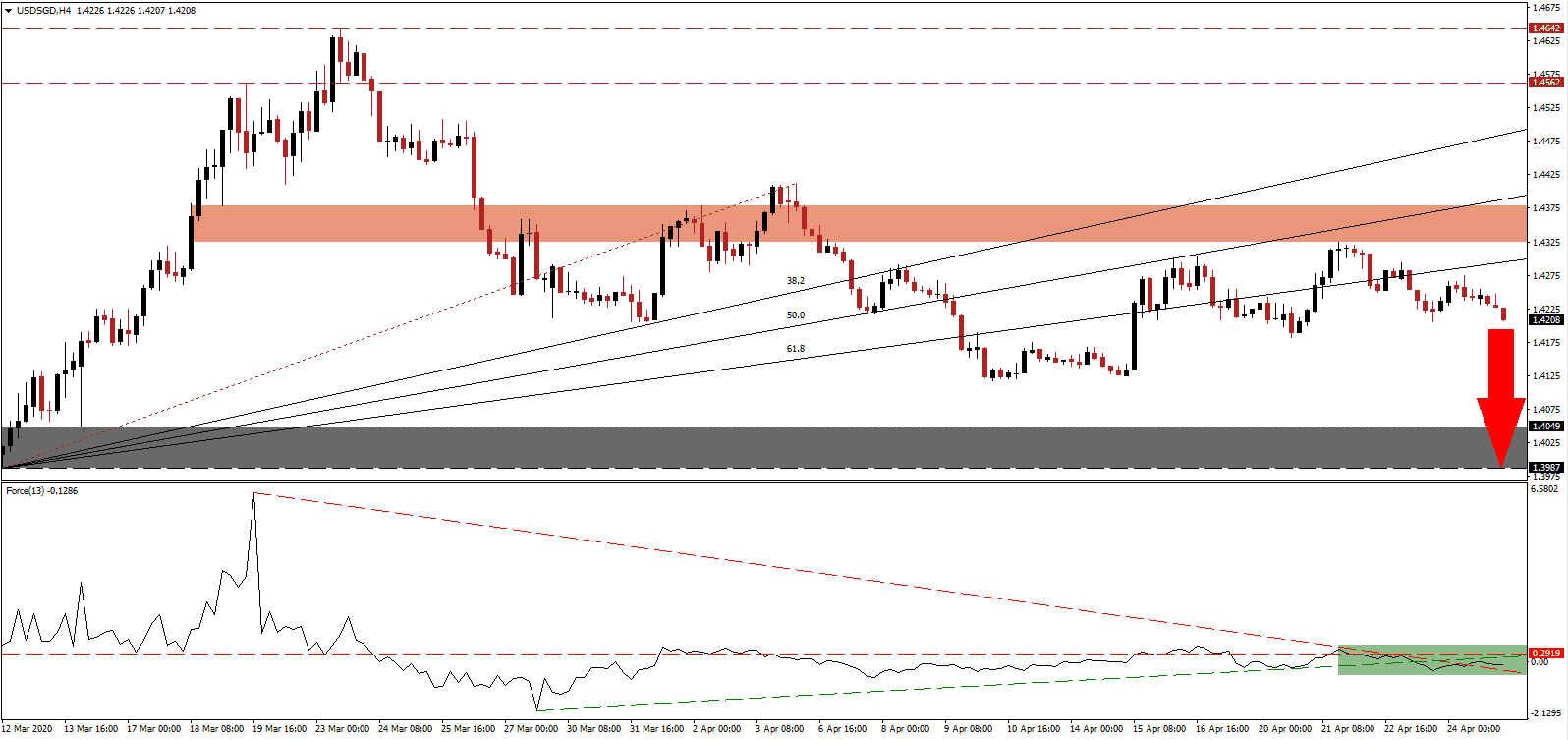 Singapore’s Trade and Industry Minister Chan Chun Sing confirmed that the city-state is bracing for a more significant economic contraction than the previously forecast 4.0% annualized GDP slump. He added the global outlook deteriorated massively over the past month, as the global Covid-19 pandemic disrupts supply chains. The first-quarter GDP posted a contraction of 10.6%, and the rise in infections caused Singapore to extend implemented circuit breakers until June 1st, the fourth extension. The USD/SGD completed a breakdown below its ascending 61.8 Fibonacci Retracement Fan Support Level, from were more downside is favored.